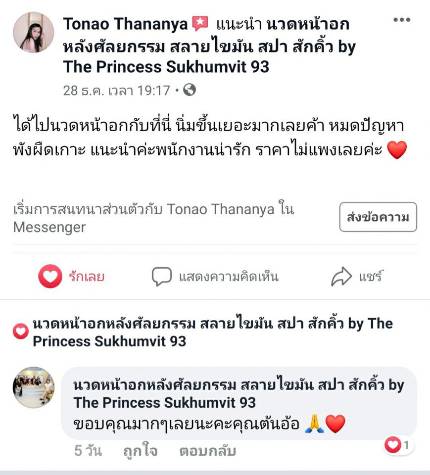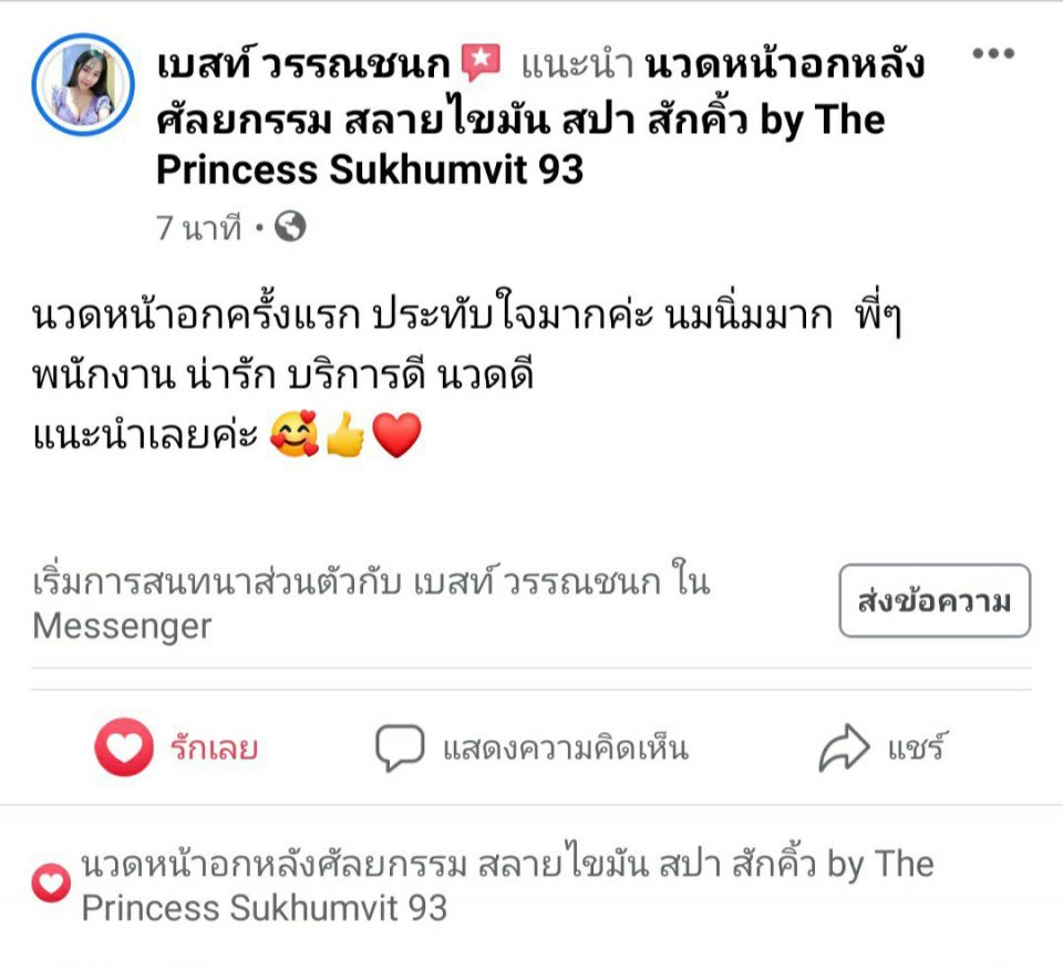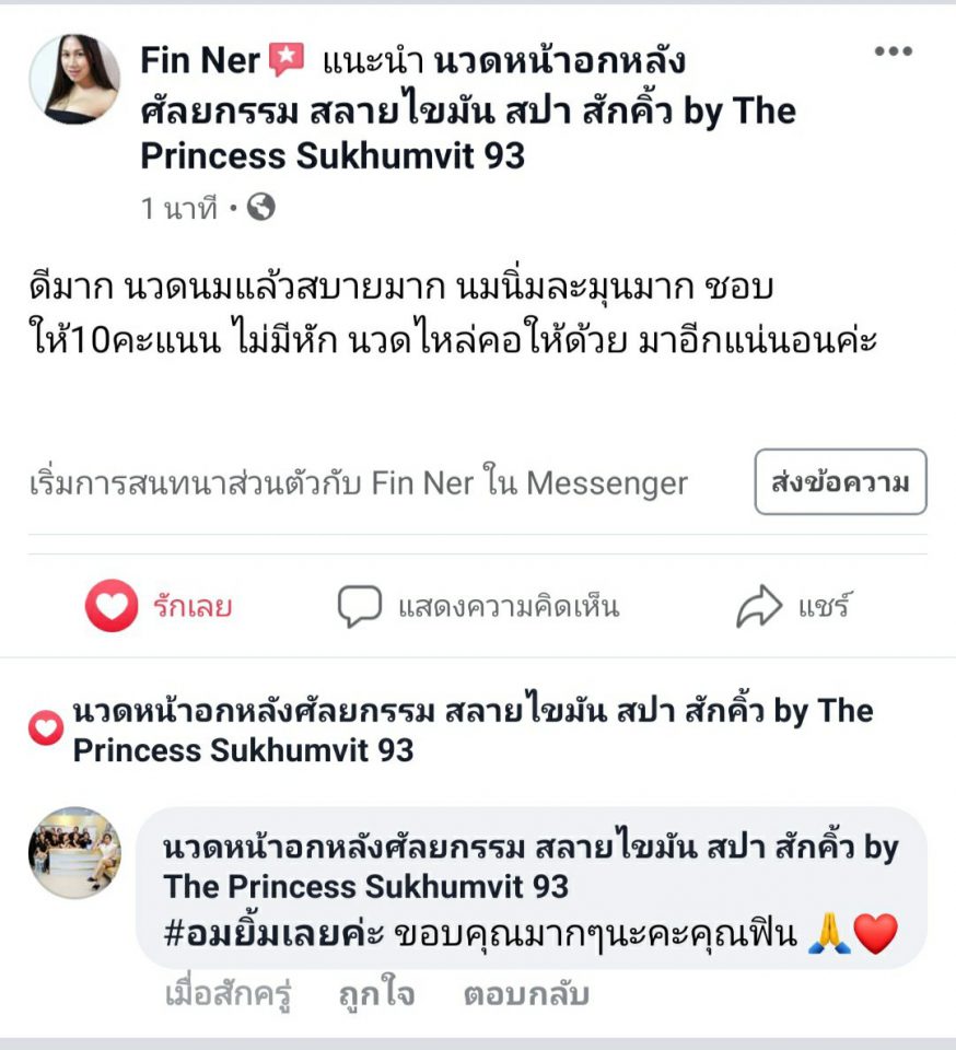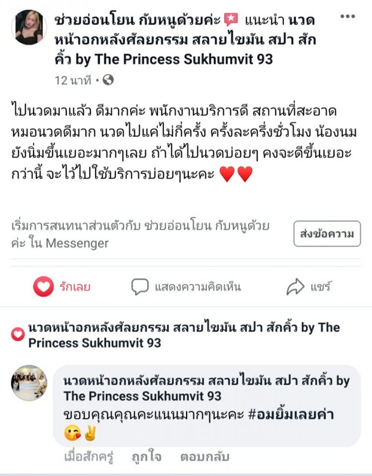 นวดนม นวดหน้าอกหลังศัลยกรรม เทคนิคเฉพาะของ เดอะปริ๊นเซสนั้นสามารถแก้ไขปัญหาของลูกค้าได้อย่างตรงจุด การันตีด้วยการปั้นแชมป์นวดระดับประเทศมามากมาย และรีวิวจากลูกค้าที่ล้นหลาม สามารถติดตามและอัพเดทได้ทาง เพจของร้านทั้ง 2 สาขานะค่ะ