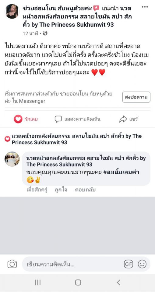 ที่นี่นวดดีมากๆ เลยค่ะ พนักงานน่ารักตั้งแต่ก้าวขาลงรถอ่ะ ยิ้ม ทักทาย พูดจาดี สถานที่ก็สะอาด เบียร์ไปนวดน่าจะรอบที่ 4 ได้ ราคาก็ย่อมเยาว์ ไปทีไรก็ชวนพี่คนนวดคุยเยอะตลอด 55555 นมนิ่มขึ้นเยอะเพราะที่นี่เลยค่ะ ใครกำลังหาที่นวดน้องนมอยู่ แนะนำที่นี่เลยจ้า